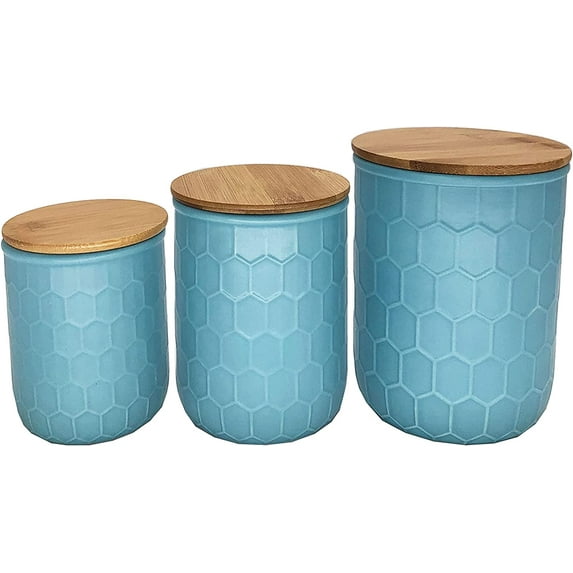 First of a Kind Kitchen Canisters - Blue Stoneware Canisters with Bamboo Lids, Set of 3 Storage Canister Container Set - Honeycomb Design, Ceramic Food Canister Jars for Tea, Sugar & Flour StorageFirst Kind Kitchen Canisters Blue Stoneware Canisters Bamboo Lids Set 3 Storage Canister Container Set Honeycomb Design Ceramic Food Canister Jars TeFirst Kind Kitchen Canisters Gray Stoneware Bamboo Lids Set 3 Storage Canister Container Honeycomb Design Ceramic Food Jars Tea Sugar FlourFirst Kind Kitchen Canisters White Stoneware Canisters Bamboo Lids Set 3 Storage Canister Container Set Honeycomb Design Ceramic Food Canister Jars TFirst Kind Kitchen Canisters Black Stoneware Canisters Bamboo Lids Set 3 Storage Canister Container Set Honeycomb Design Ceramic Food Canister Jars T