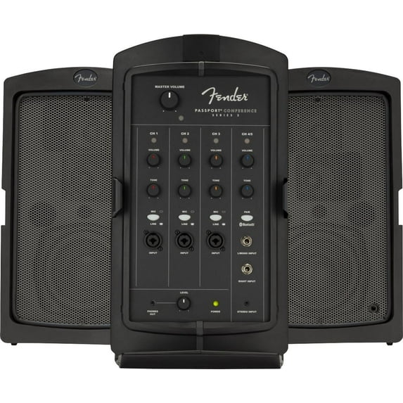 With easy-to-use features and great go-anywhere portability, the passport conference series 2 audio system is ideal for small to medium-size audiences. With Bluetooth audio streaming, its full-range speakers, versatile features, friendly front-panel controls, and 175 watts of power provide clear and reliable Fender sound ideal for a wide range of uses - educational, sporting, and worship events; meetings, seminars, and presentations, and musical performances at parties, small clubs, coffeehouses and much more. Conveniently self-contained with suitcase-style portability and easy setup has everything you need for great sound anywhere, anytime.