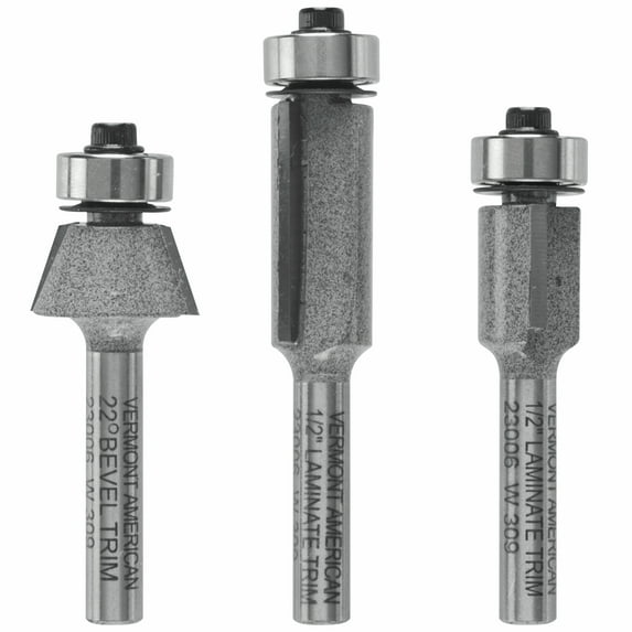 - Trim set includes 0.5 inch x 0.5 inch laminate trim bit, 22-degree bevel trim bit and 0.5 inch x 1-inch laminate trim bit