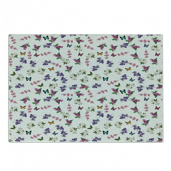 Hero image 0 of Floral Cutting Board, Bouquet of Purple Spring Flowers a Magnolias Violets and Flying Tiny Butterflies, Decorative Tempered Glass Cutting and Serving Board, in 3 Sizes, by Ambesonne, 0 of 2
