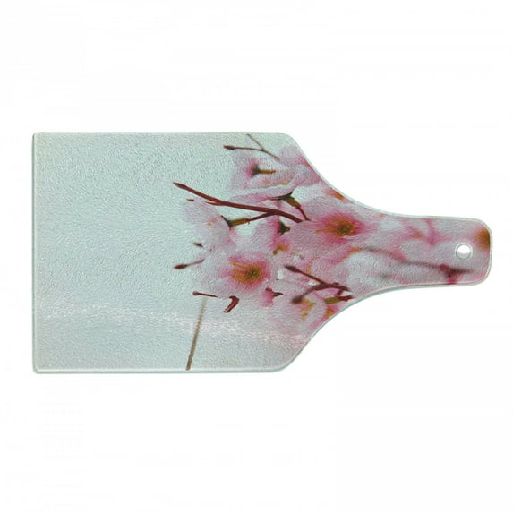 Hero image 0 of Floral Cutting Board, Cherry Blossom Petals Spring Season Florets in Soft Pastel Tones Art Print, Decorative Tempered Glass Cutting and Serving Board, Wine Bottle Shape, Pale Pink White, by Ambesonne, 0 of 1