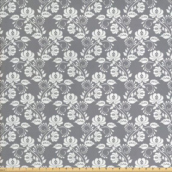 Hero image 0 of Floral Fabric by the Yard, Flower Silhouettes with Lace Patterned Background Leaves Swirls Dots Abstract Image, Decorative Upholstery Fabric for Sofas and Home Accents, Grey White by Ambesonne, 0 of 4