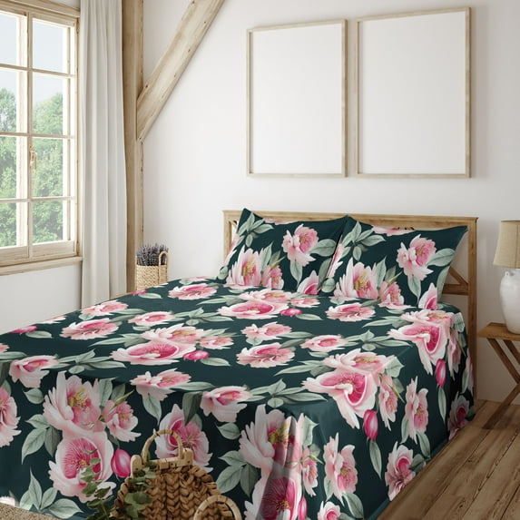 Hero image 0 of Ambesonne Floral Fitted & Flat Sheet with Shams 4 Pcs Set, Roses Lovers Flowers Artwork, Queen, Laurel Green Pale Pink, 0 of 1