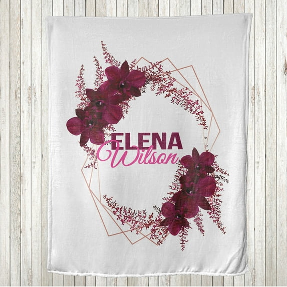 Floral Throw Blanket, Boho Autumn Flowers with Geometric Frame Botanical Blossom Exotic Garden, Flannel Fleece Accent with Custom Name Photo Backdrop, 80" x 60", Maroon Raspberry Rose, by Ambesonne