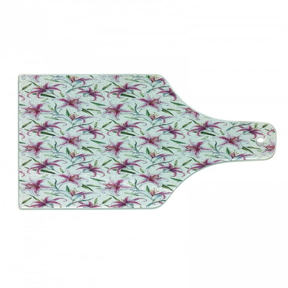 Hero image 0 of Flower Cutting Board, Tropical Watercolors Vivid Lively Lily Flower Wild Nature Plants Image, Decorative Tempered Glass Cutting and Serving Board, Wine Bottle Shape, Purple Green, by Ambesonne, 0 of 1
