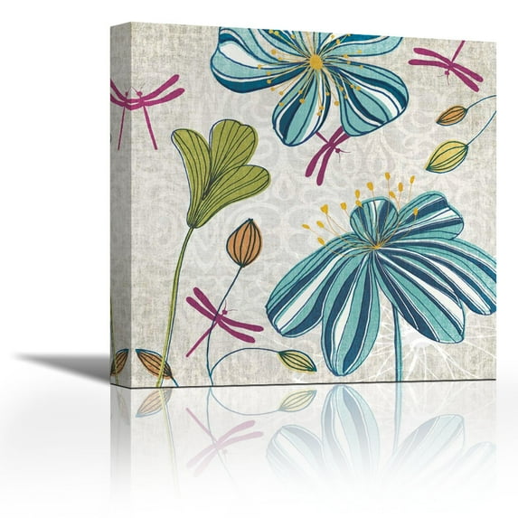 Flowers and Dragonflies - Contemporary Fine Art Giclee on Canvas Gallery Wrap - wall décor - Art painting - 18 x 18 Inch - Ready to Hang