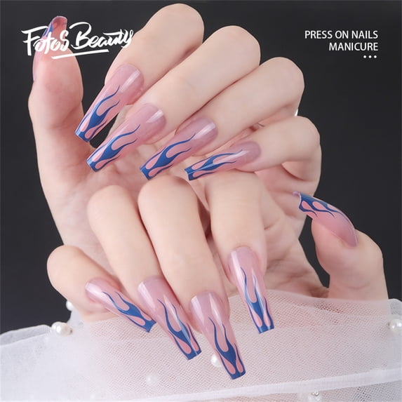 Fofosbeauty 24pcs Press on False Nails Tips, Coffin Fake Nails, Coffin Blue Flames Pink