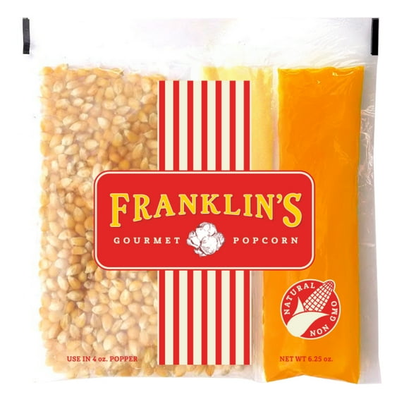 Hero image 0 of Franklin’s Gourmet Popcorn All-In-One Pre-Measured Packs - 4oz. Pack of 5 - Butter Flavored Coconut Oil, Premium Butter Salt, Classic Corn - Movie Theater Taste - Made in USA, 0 of 6