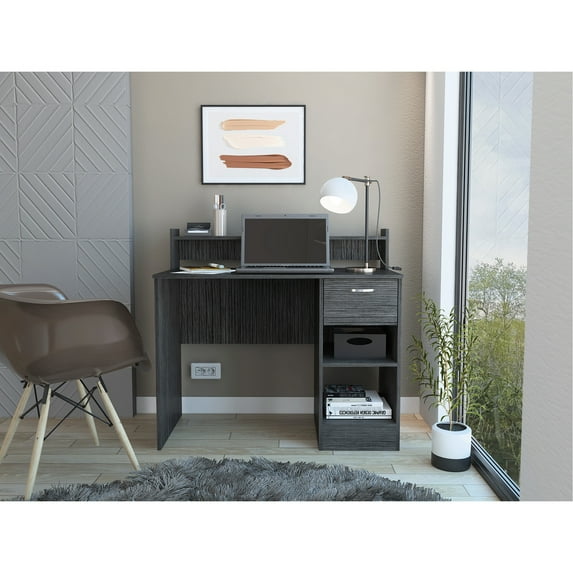 enhance your work efficiency with writing computer desk. this desk is designed to meet needs of today's busy professionals. spacious work surface provides a area for you to focus on your work. drawer and open shelves allow for easy organization of your office supplies, ensuring that everything is within reach. modern and sleek design of desk, in a grey color, adds a contemporary touch to your office. crafted from engineered wood, it is built to withstand rigors of daily use. with dimensions of 40.2 inches wide, 19.73 inches deep, and 37.11 inches high, it is perfect addition to any office. : efficiency desk, surface, easy organization, contemporary touch, construction, daily use durability