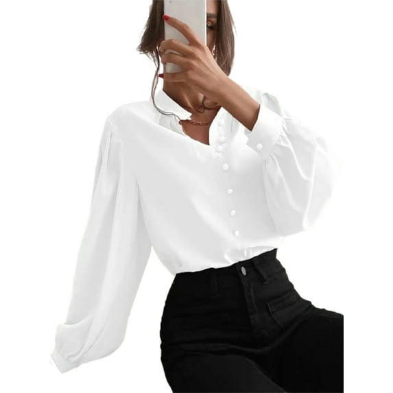 Hero image 0 of Frontwalk Women Elegant Lantern Sleeves Blouse Long Sleeve Plain Formal Tops Button Down Casual Work Office Shirts White S, 0 of 3