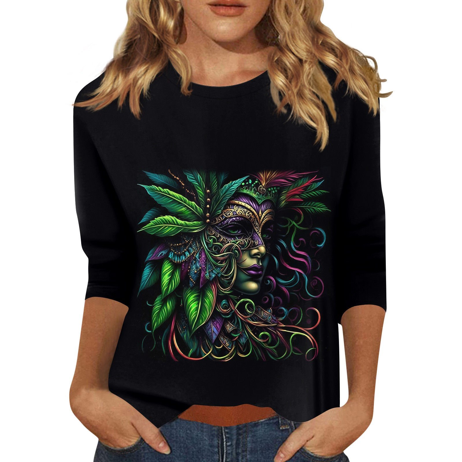 Hero image 0 of FrzhBrz Mardi Gras T Shirts for Women 3/4 Sleeve Round Neck Carnival Costume Mask Print Party Parade Blouses Pullover Casual Loose Fit Mardi Gras Tops, 0 of 5