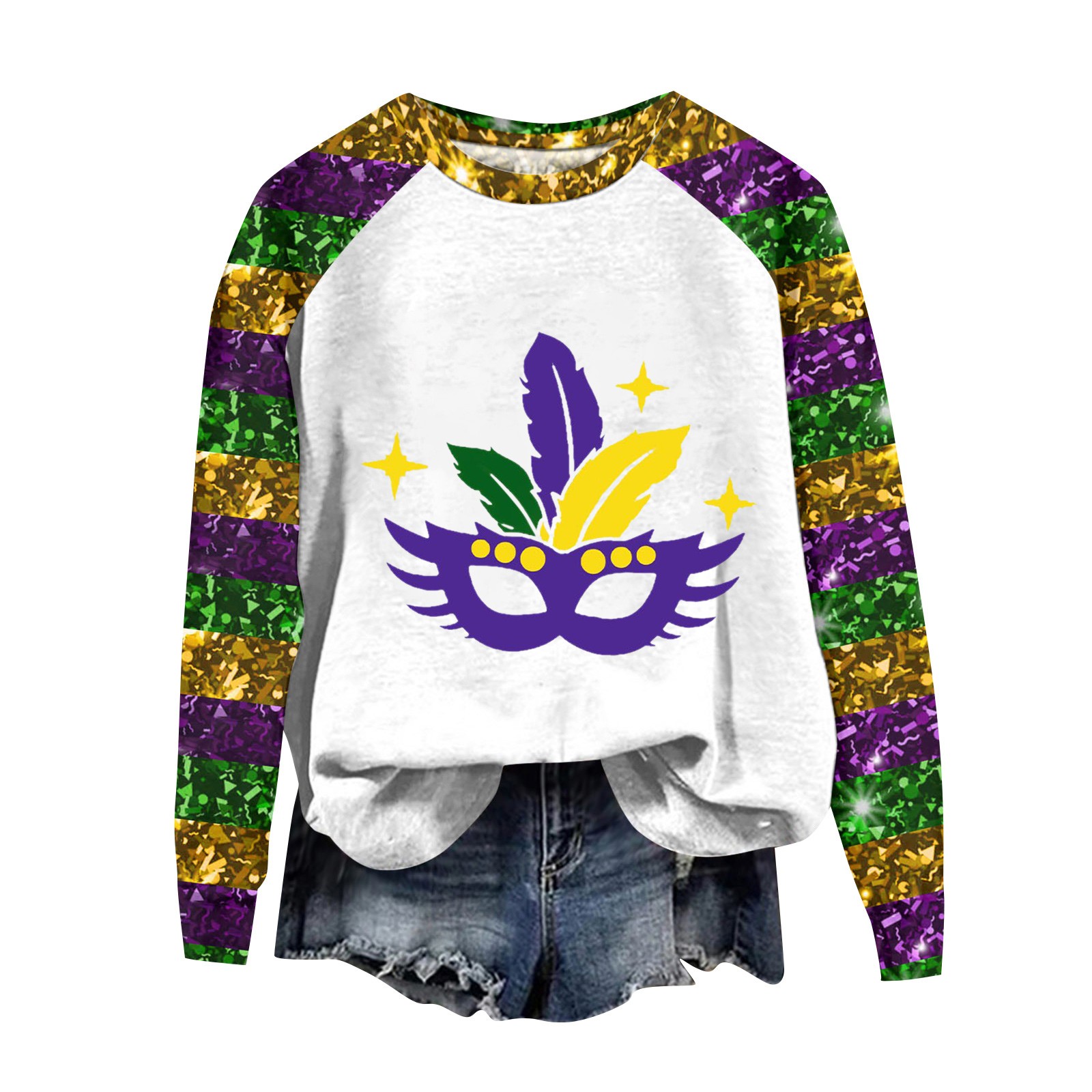 Hero image 0 of FrzhBrz Mardi Gras T Shirts for Women Long Sleeve Round Neck Carnival Themed 3d Print Party Parade Blouses Pullover Casual Loose Fit Mardi Gras Tops, 0 of 4