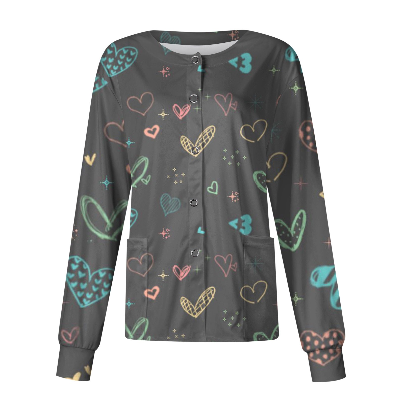 FrzhBrz Valentines Day Scrub Jackets for Women Long Sleeve Snap Front Love Heart Scrub Tops Valentine's Day Scrubs Nurse Uniforms