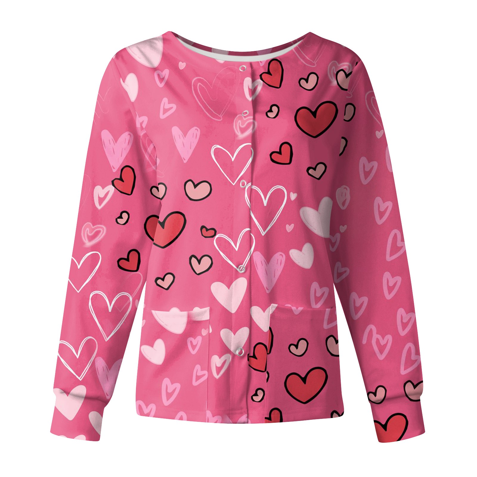 FrzhBrz Valentines Day Women's Scrub Jacket Plus Size Long Sleeve Fun Heart Printed Valentine's Day Workout Casual Shirts