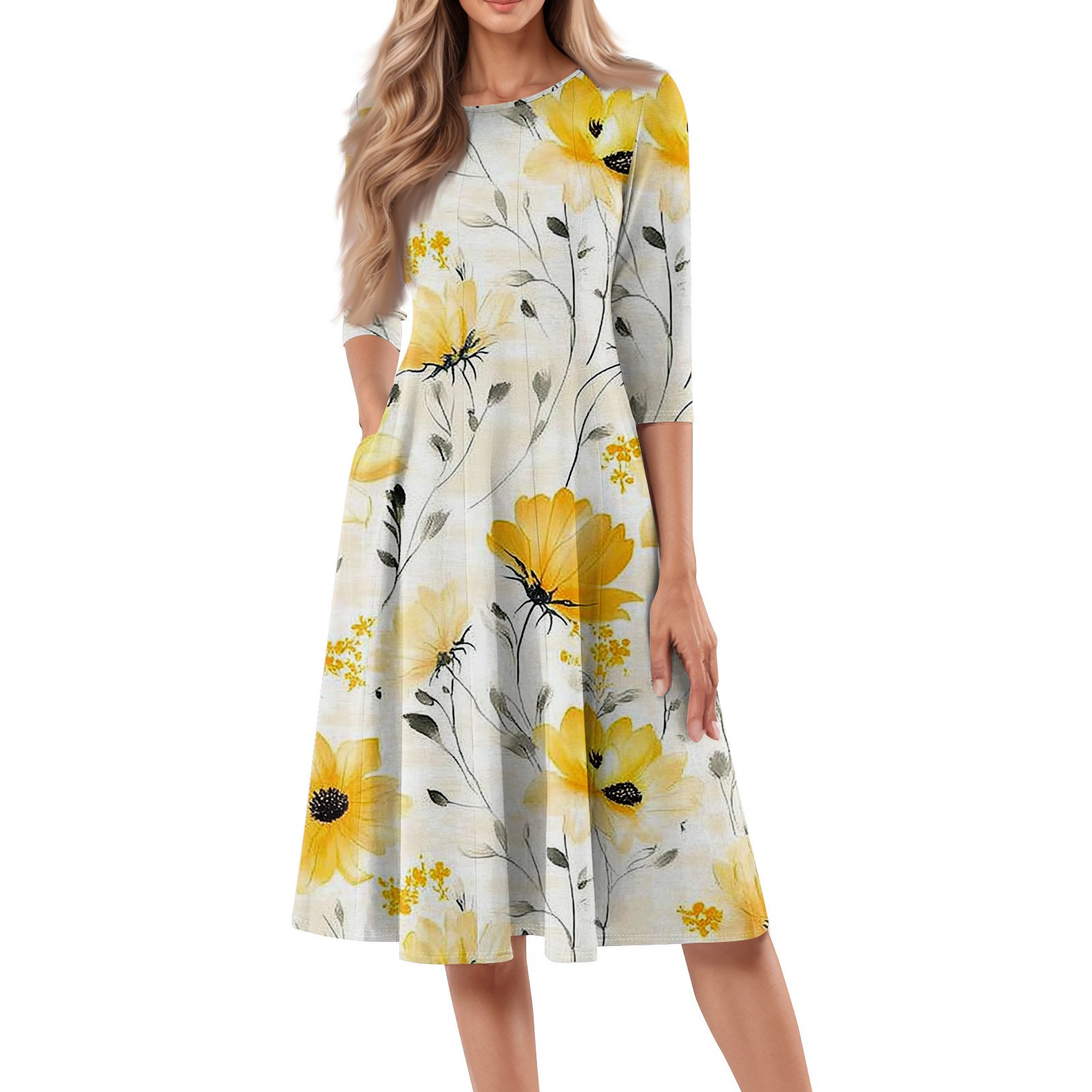 FrzhBrz Womens 2025 Spring Trendy Crew Neck 3/4 Sleeve A Line Vintage Print Flare Midi Dress Loose Casual Midi Long Dresses with Pockets