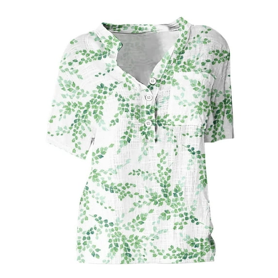Fsqjgq Women's Casual Floral Print Summer Shirts Womens V Neck Tops Womens Button Up Cotton and Linen Short Sleeve Printed Floral Blouse with Pocket Green Xl