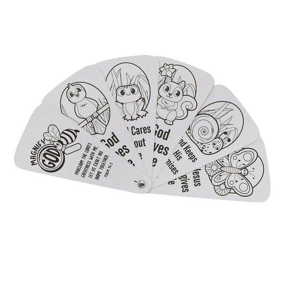 Kids can create their own handmade fan with this color your own activity! Featuring 6 pieces that each have an animal image and either a Bible quote or inspirational phrase, this fan is a great supplement to a Zoom In VBS curriculum. Supply kids with markers, colored pencils or crayons (all sold separately on this site) and allow them to create their own design, assemble the fan and then take it home as a reminder of the fun they had at VBS. Size: 3" x 6" Quantity: 12 Material: Each fan includes 6 cardstock pieces and 1 silvertone metal brad.