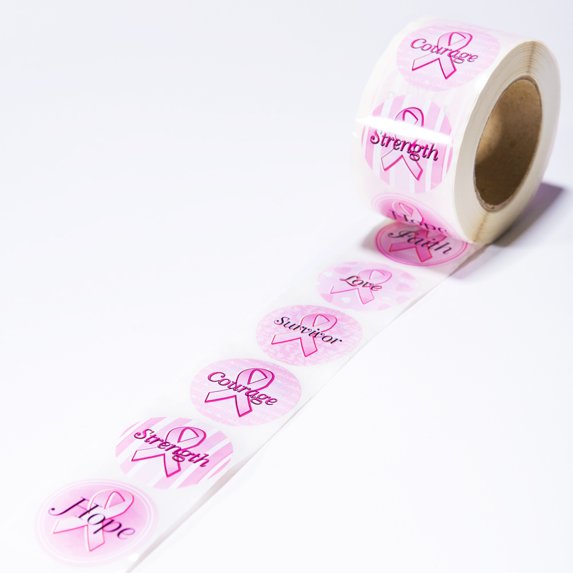 Breast Cancer Awareness Sticker Rolls. These 1 1/2 stickers carry an important message. Courage hope faith and strength give this jumbo roll big impact. Add them to gift bags use them as seals for fundraiser and banquet invitations adhere them on clothing to show your support at your local 5k pink ribbon walk/run — there are dozens of uses for these breast cancer ribbon stickers. With 500 stickers on every roll you'll have plenty to hand out to help you raise awareness and show your support. (5