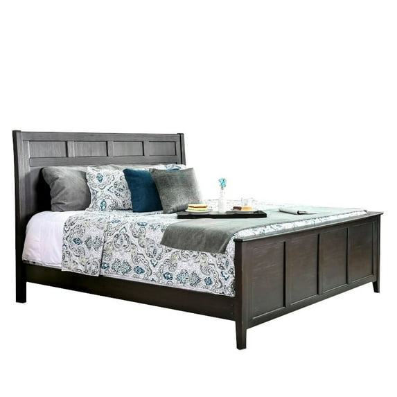 Minimalistic yet chic, this simple bed provides a sleek and welcoming ambiance for your room. A set of tapering block legs provide plenty of support for this piece, keeping attention on the headboard and footboard details. The paneled headboard and footboard create a chic appearance that enhances the transitional vibe of the room. Available in multiple sizes, this bed is finished in a sleek wire-brushed black color to easily meld with any bedroom décor. Finish: CherryMaterials: Solid Wood, Wood Veneer, and MetalContemporary StyleFive (5) drawers on metal glidesEnglish dovetail drawer constructionFelt-lined top drawerSleek silver-tone drawer pullsMatching casegoods available, sold separatelySpecifications:Overall Product Dimensions: 56" H x 87.25" W x 80" DOverall Product Weight: 156 lbs