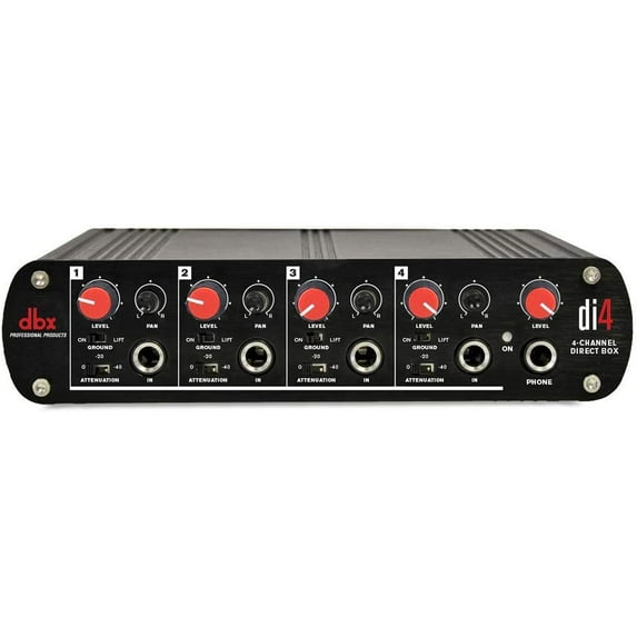 Four totally independent DI box units, Independent 20dB pad switch per channel, Independent ground (earth) lift switch per channel, Independent volume control per channel for line mixer output, Independent pan control per channel for line mixer output, Master volume, Headphone output