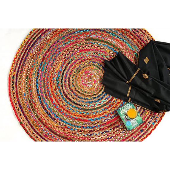 GRUHUM Natural Round Handmade Colourful Jute Area Rug 4x4 Soft Braided for Indoor Outdoor Kitchen Dining Living Room Bedroom Hallways
