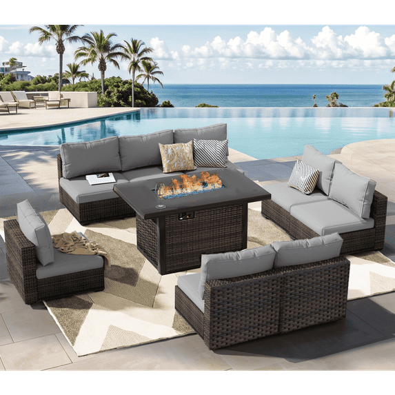 Gaildon 9 Piece Patio Furniture Set with Fire Pit Table, All Weather Outdoor Sectional PE Rattan, Patio Conversation Sets with Cushions for Garden Lawn Balcony Porch Deck, GreyGaildon 9 Piece Patio Furniture Set Fire Pit Table Weather Outdoor Sectional PE Rattan Patio Conversation Sets Cushions Garden Lawn Balcony Porch DecGaildon 9 Piece Patio Furniture Set Fire Pit Table Weather Outdoor Sectional PE Rattan Patio Conversation Sets Cushions Glass Coffee Table Garden LawGaildon 9 Piece Patio Furniture Set Fire Pit Table Weather Outdoor Sectional PE Rattan Patio Conversation Sets Cushions Garden Lawn Balcony Porch DecGaildon 9 Piece Patio Furniture Set Fire Pit Table Weather Outdoor Sectional PE Rattan Patio Conversation Sets Cushions Garden Lawn Balcony Porch DecGaildon 9 Piece Patio Furniture Set Fire Pit Table Weather Outdoor Sectional PE Rattan Patio Conversation Sets Cushions Garden Lawn Balcony Porch Dec