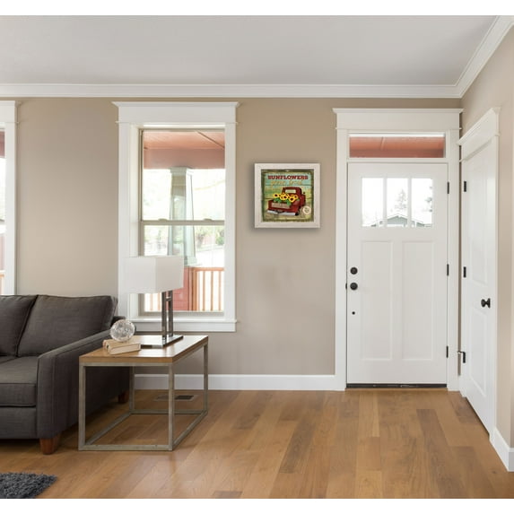 Gango Home Decor Rustic Sunflowers & Pickup Truck Wall Art; One Red 12x12in Art Print in Distressed White Frame