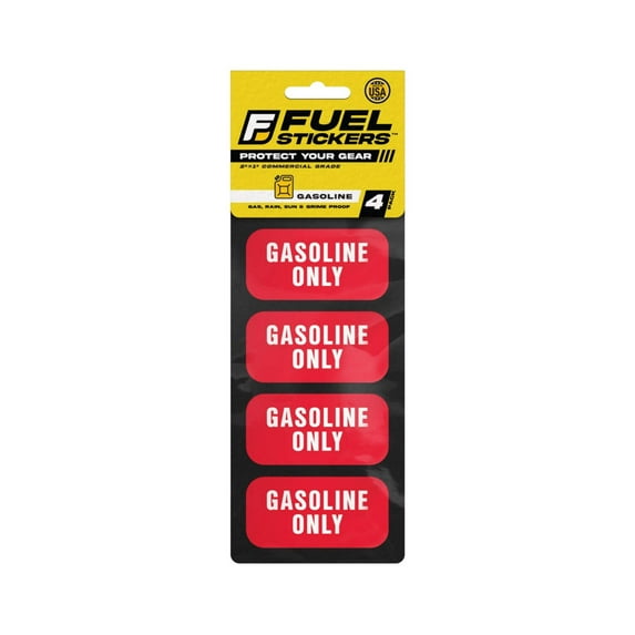 Avoid costly fuel mix-ups. This 4-pack Gasoline Only Sticker is made for labeling tanks, cans, or machines that run on gas—fast, clear, and permanent. Printed bold red on premium vinyl, each gasoline label measures 2"x1" and sticks firm with industrial-grade adhesive.