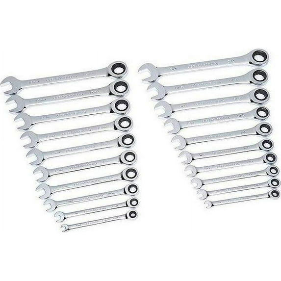 - Includes 10 ratcheting wrenches in SAE sizes 1/4 in., 5/16 in., 11/32 in., 3/8 in., 7/16 in., 1/2 in., 9/16 in., 5/8 in., 11/16 in., and 3/4 in. and 10 ratcheting wrenches in Metric sizes 6, 8, 10, 12, 13, 14, 15, 16, 17, and 18 mm