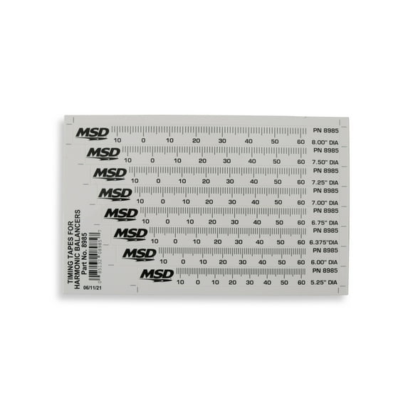 Accurate ignition timing is one of the most vital adjustments you can make to your engine. Proper timing can mean the difference between winning and losing a race or even blowing an engine (as a worst case scenario). Recognizing the importance of the timing, MSD offers these Timing Tapes. The MSD Timing Tape comes with eight different tapes to fit common balancers ranging from 5.25 in. to 8 in. in diameter. The tapes are marked off in one degree increments from 14° ATDC to 64° BTDC and are printed on a tough, chemical resistant material.Not only do the MSD Timing Tapes help you get an exact timing setting, they allow you to see exactly where the Total timing is set. Remember, the Total timing is just as critical as the initial timing and the MSD Timing Tape will help you ensure that it is set accurately.;