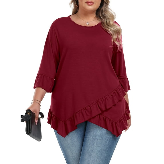 Hero image 0 of Gleelist Plus Size Tops For Womens Ruffled Hem Crew Neck T-Shirts Casual Flowy Blouses 3/4 Ruffle Sleeve XL-5XL, 0 of 9
