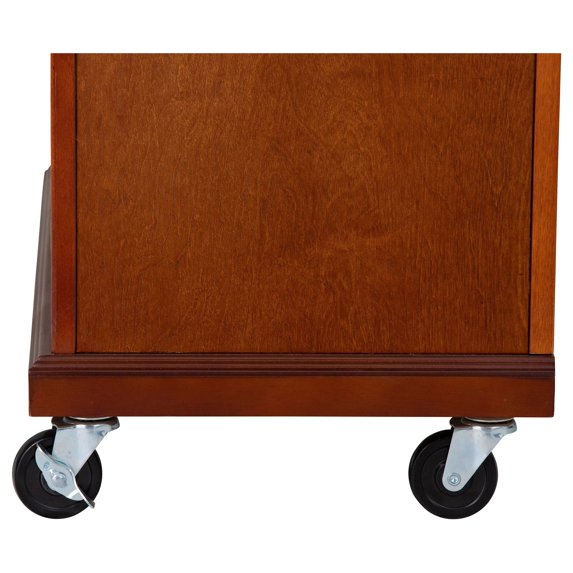 Constructed of solid hardwood and wood veneers, this mobile kitchen island is built to last. The patented no tool easy process saves valuable time, allowing you to enjoy your furniture in just minutes, without sacrificing quality. The raised panel doors and drawer fronts add high-end style that will dress up any kitchen. Drawers provide plenty of storage for a multitude of household items. An adjustable/removable shelf can be found behind each door. Abundant storage abounds for those items that you wish not to be seen. An open storage area in the center also includes adjustable/removable shelves. This open storage area is perfect for stemware, wine bottles, or any other items that you would like to display. A handy spice rack provides convenience when preparing a meal on your cart. The included towel bar/paper towel holder saves valuable space in other areas of your kitchen. Heavy duty locking metal casters provide additional functionality, allowing the cart to be moved wherever it may be most useful. Engaging the locking mechanisms on the casters provides stability, preventing movement when the cart is placed in its desired location. Functionality, combined with style and quality, make this kitchen cart a wise addition to any home.; Total of four adjustable shelves inside cabinet; Spice rack with towel bar; Towel bar/paper towel holder; Premium ball bearing drawer glides; Natural wood top; Durable casters provide flexibility and style; Distressed finish: No; 2 drawers for storage; 2 storage cabinets; Available in: Antique Black, Antique White, Cherry, Antique Earth Green finishes; Kitchen Carts: 36" H x 52" W x 17.75" D - 114 lbs; UPC Codes: 710262015505, 710262015512, 710262015529, 710262015536, 710262015543, 710262015550, 710262015567, 710262015574, 710262015581, 710262015598, 710262015604, 710262015611, 710262015628, 710262015635, 710262015642, 710262015659; ; ; ; ;