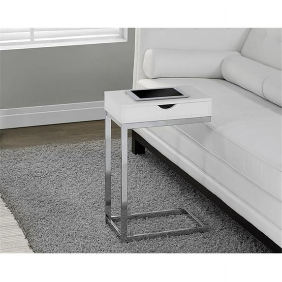This beautiful glossy white finished hollow-core accent table has sufficient space for you to place your snacks, laptop or tablet as well as offering a large storage drawer for remote controls, magazines, etc. The chromed metal base provides sturdy support along with a fashionable touch that will suit any décor.