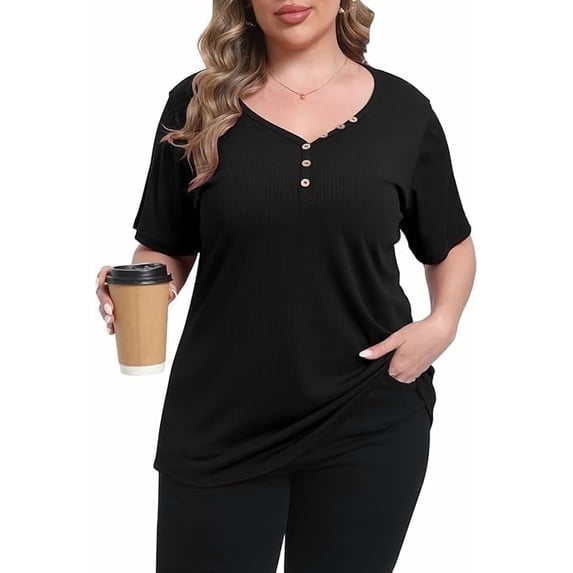 Hero image 0 of Gocolloa Womens Plus Size Button Up V Neck Tops Short Sleeve Ribbed T Shirts Summer Loose Dressy Tunic Black 3X, 0 of 7