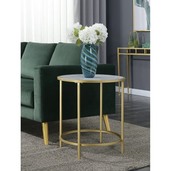 Add luxury to your home with the Gold Coast Faux Marble Round End Table from Convenience Concepts. Featuring a contemporary style with glamourous finishes, this end table will upgrade your décor and charm its way into becoming a staple in your home. Its clean-lined silhouette and ample table top ensure the perfect display space for your favorite collectibles. The base is crafted from gold powder coated metal and table top is made of MDF and finished with a beautiful glossy white faux marble with gray veining, this table will beat the test of time while ensuring easy maintenance. With its simplistic design the Gold Coast Faux Marble Table can fit seamlessly into your living room as an end table or add some glam to your bedroom as a nightstand. Enjoy right after delivery with its quick and easy assembly in only 2 steps. Look for additional pieces from the Gold Coast Collection from Convenience Concepts, each sold separately. Overall Item Dimensions: 20.25"L x 20.25"W x 22"H