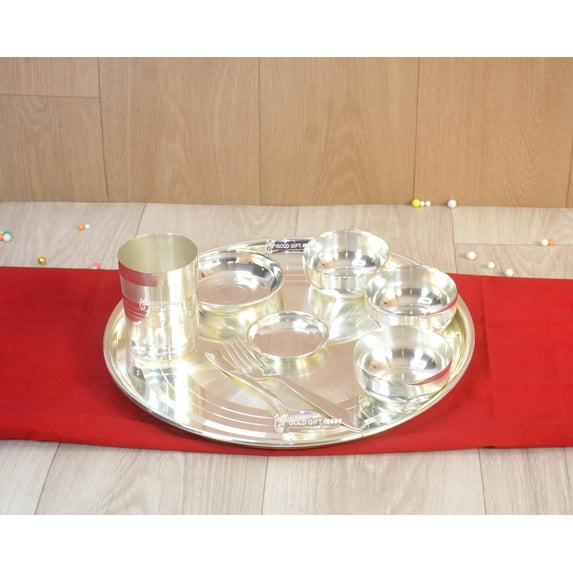 - Package Contains - 9 Items, Material - Silver Plated, Detail Dimension - Thali - 12 Inch, Bowl - 3.5 Inch, Bowl - 3.5 Inch, Bowl - 3.5 Inch, Katori - 4 Inch, Small Katori - 2 Inch, Glass - 4.5 Inch, Spoon - 12 CM, Color - Silver