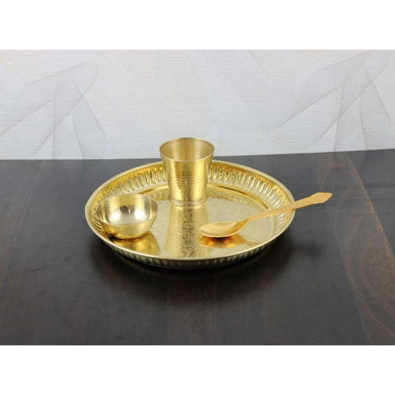 - Package Content: Brass Dinner Set, Material: Brass, Detailed Dimensions: Thali - 7 Inch, Katori - 2.17 Inch, Glass - 1.96 Inch, Spoon - 4.72 Inch, Colour: Gold