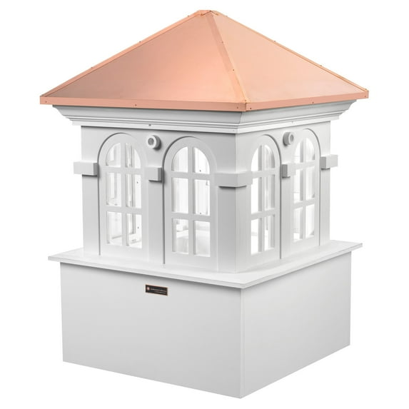 The Good Directions Smithsonian Chesapeake Vinyl Cupola lets you add light and airflow to the roof of your home, workshed, or barn. Whether you're looking for a functional or decorative unit, look no further than this Italian-inspired cupola. Its base features an arched-window design and is made using weather-resistant vinyl boards. The slanted roof features 24-gauge copper panels and can easily be fitted for a weathervane. The piece is unpainted, letting you customize its color as you please. Mounting hardware for a weathervane attachment is included (weathervane sold separately).