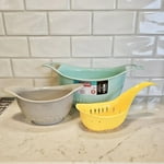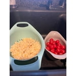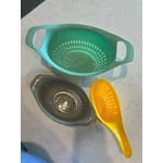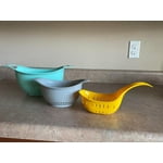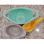 I wish I had found these and ordered them long ago. The larger colander I have is huge, and it is kind of a pain to manipulate. And the small wire mesh strainer, while it works well, can only hold a very small volume of food, and I found my linguini or whatever was totally overwhelming it, even though the pasta was a serving for one person. So using the teal colander, the largest one, was great, as it was just what I was needing, and hoping to find. And the three little nesting colanders are easy to store in my already over-full cabinet, so they are easy to find and pull out to use.