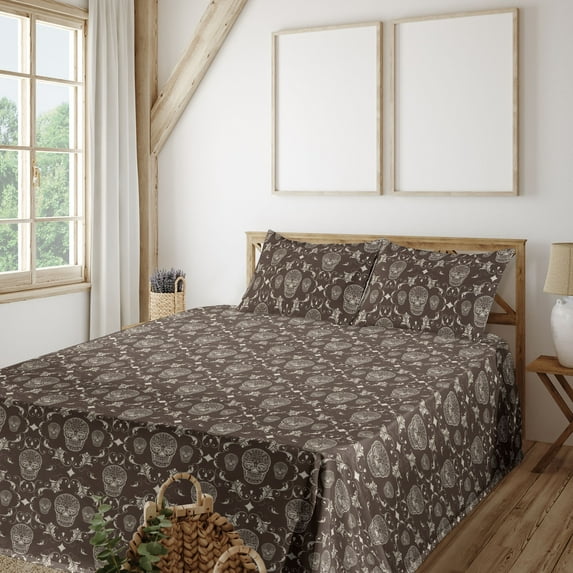 Ambesonne Gothic Fitted & Flat Sheet with Sham 3 Pcs Set, Retro Rococo Skull Pattern, Twin XL, Pale Grey Umber