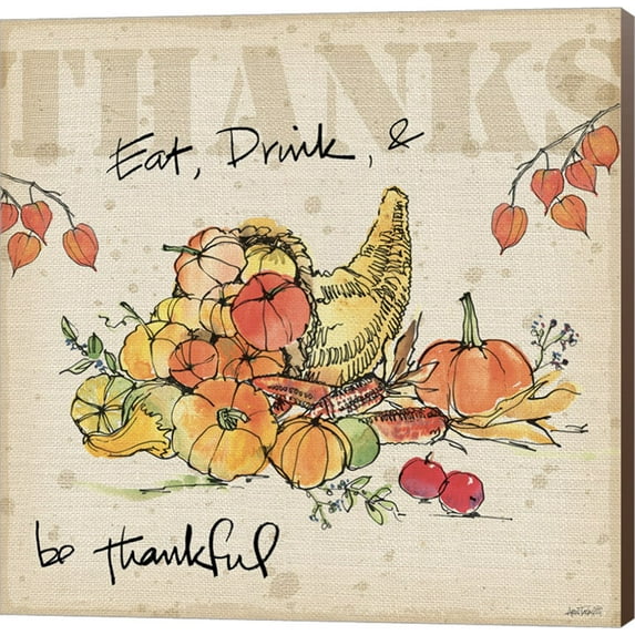 Be Thankful III by Anne Tavoletti is a high quality piece of canvas artwork. The finished size of this piece is 12" X 12", and it has a depth 1.5" with nutmeg painted sides. There is a UV protective coating over the entire image, and it is ready to hang on your wall with no hardware required. Hand made in the USA. 100% Satisfaction Guaranteed.