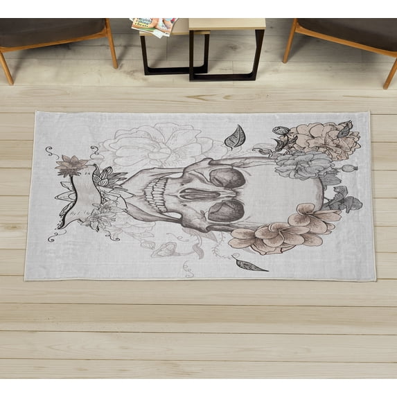 Hero image 0 of Grunge Decorative Rug, Skull and Flowers Day of the Dead Mexican Traditional Celebration Symbolic Art, Quality Carpet for Bedroom Dorm and Living Room, 6 Sizes, Grey and Peach, by Ambesonne, 0 of 1