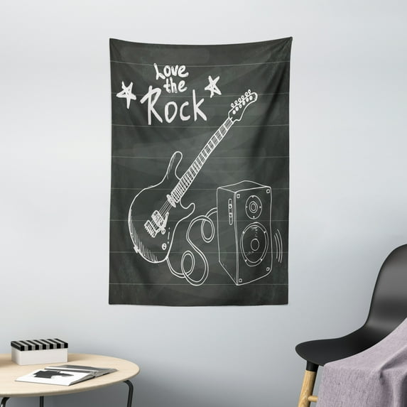 Guitar Tapestry, Love The Rock Music Themed Sketch Art Sound Box and Text on Chalkboard Print, Wall Hanging for Bedroom Living Room Dorm Decor, 40W X 60L Inches, Dark Taupe White, by Ambesonne