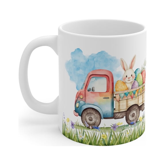 This Easter Bunny Coffee Mug is the perfect gift for any coffee or tea lover! Made from high-quality ceramic, this adorable rabbit mug holds up to 11oz of your favorite hot beverage. Its cute design features the Easter bunny in a pickup truck with colorful Easter eggs, making it the perfect addition to any Easter-themed kitchen or dining room. Don't miss out on the opportunity to give the gift of cuteness this Easter season!