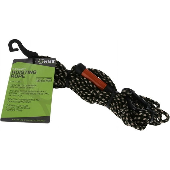 The archery hunter's dream come true...a quick, easy, and secure means to easily lift and lower their bow when hunting from a treestand. The HME Maxx Treestand Hoist Rope provides a coated carabiner style hook that allows the archer to quickly install over the bow's upper limb in seconds. Once installed the PVC coating and unique shape securely holds the bow when raising or lowering. The Maxx Hoist is 25 feet long and has a sleeve and reflective wrap at the bottom. For proper use the Maxx Hoist needs to be tied off to the tree stand at a height that when hanging their bow will not touch the ground.