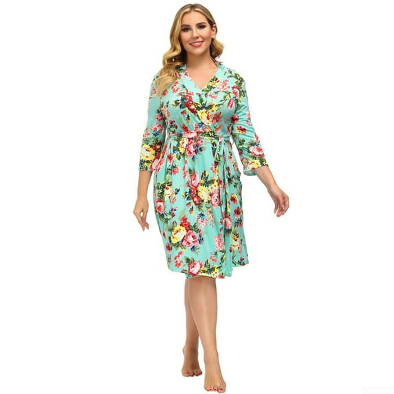 HN Women Plus Size Surplice V-Neck Sleep Robe Floral-Print Loungewear 3/4 Sleeve Bath Robe