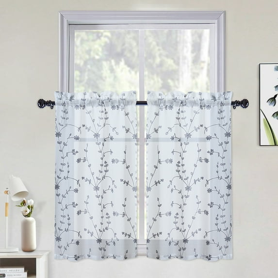 Hero image 0 of HOMERRY Cafe Curtains 26" W x 36" L Sheer Floral Leaf Embroidered Kitchen Curtains Voile Linen Texture for Bedroom Bathroom, Gray, Set of 2, 0 of 8