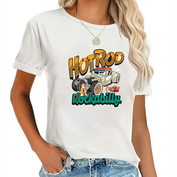 Hero image 0 of HOT ROD CAR AND PIN UP ROCKABILLY GIRLS American Retro Womens Cool T Shirts White, 0 of 5