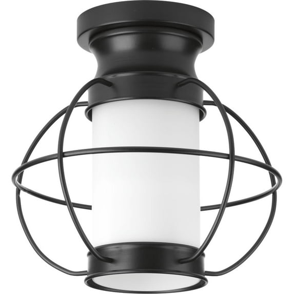 A classic New England coach light, the Haddon one-light flush mount features an etched opal diffuser paired with classic Black. The wire surround is a classic industrial-inspired detail that provides nostalgic charm.