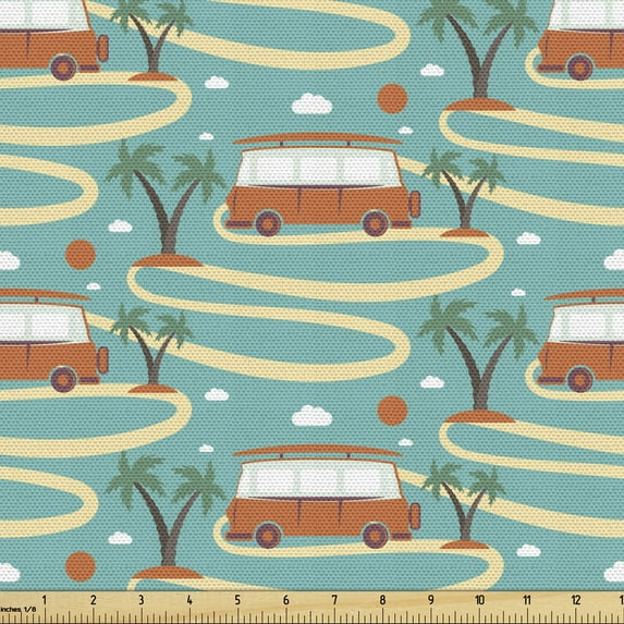 Hero image 0 of Happy Camper Fabric by the Yard Upholstery, Pattern of Sun Palms and Van on Road Summer Travel Holiday Theme, Decorative Fabric for DIY and Home Accents, 2 Yards, Seafoam and Multicolor by Ambesonne, 0 of 4